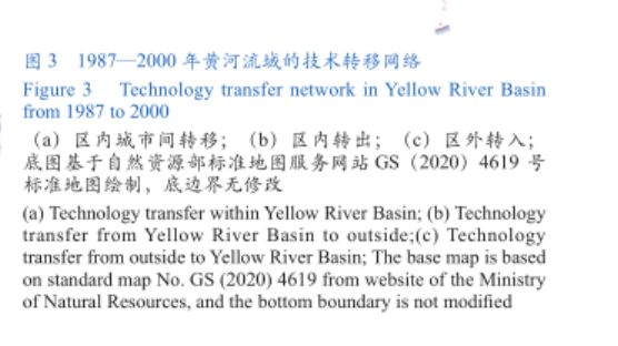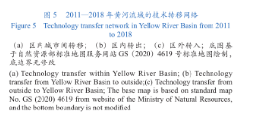 区内城市间转移。参与流域内技术转移的城市数量下降至55个,93对城市间发生技术转移444次。其中,技术转移仍以省内城市间技术转移为主,技术转移路径主要为西安→宝鸡、济南→济宁、滨州→青岛等。总体来看,技术转移以陕西、山东两省内的城市间技术转移为主,河南、山西城市间的技术转移显著增加,济南、西安、郑州3个省会城市是主要技术源地,宝鸡、青岛、济宁、济南、西安等城市是主要技术承接地,地理邻近仍然是影响流域内部技术转移网络结构演变的主要驱动因素,技术转移网络的“核心—边缘”结构特征突出(图5)。