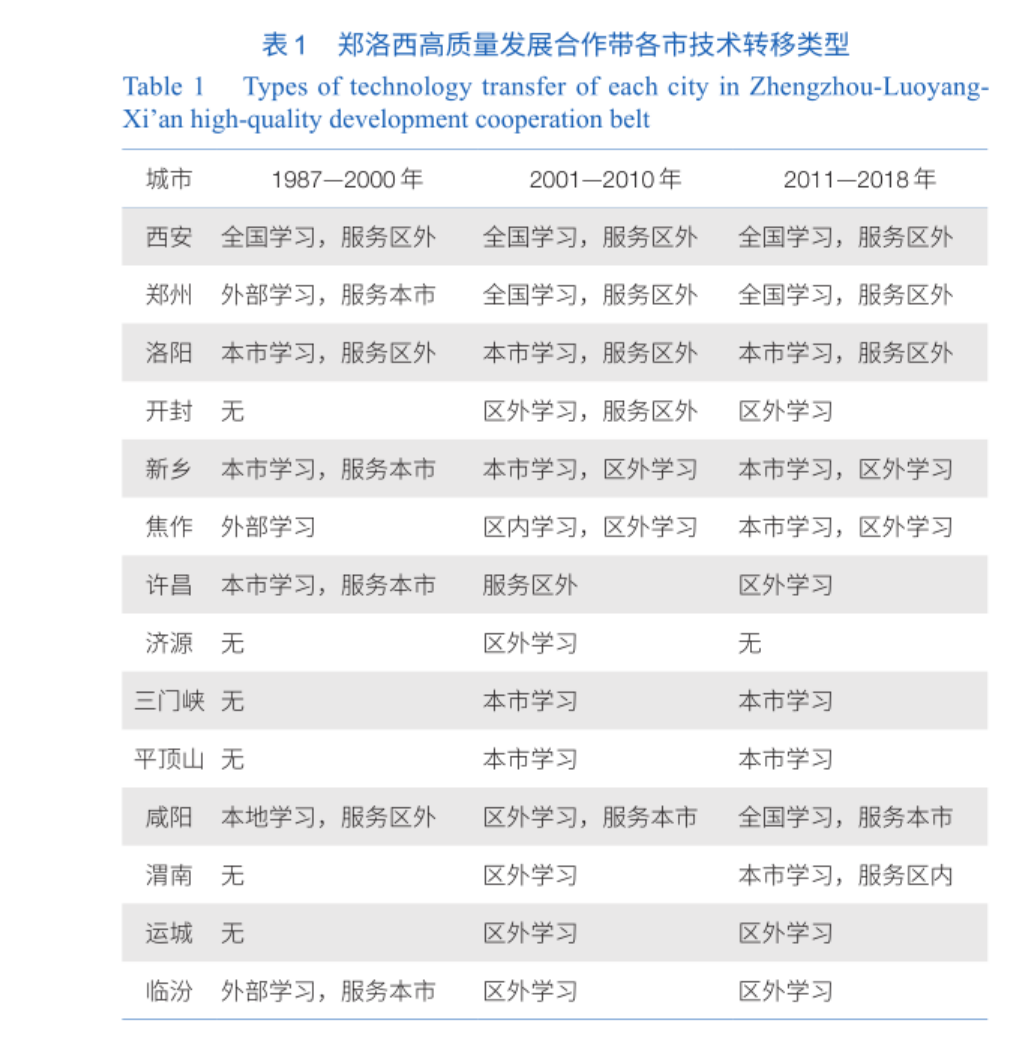 将同城转移看作本市学习、区内城市间转移看作区内学习、区外转入看作区外学习、区内转出看作服务区外。如果一个城市的本市学习、区内学习、区外学习占比均较高,表示该城市的技术来源于全国,可称之为“全国学习”;反之,如果区内转出比重较高,则称之为“服务区外”。分析发现,郑州、西安和洛阳是技术枢纽城市,向流域外部技术转出现象显著。不同的是,郑州和西安两市侧重从全国范围内获取所需技术资源,而洛阳市的技术获取则以本市为主,区外技术获取较少。新乡、焦作、运城、临汾等城市为技术吸收区,对内—对外技术转出现象均不明显,其中新乡、焦作等市的技术来源以区外和本市技术为主,运城、临汾则以流域外部的技术获取为主。开封作为技术外联区,技术获取和转出均以流域外部的城市为主(表1)。