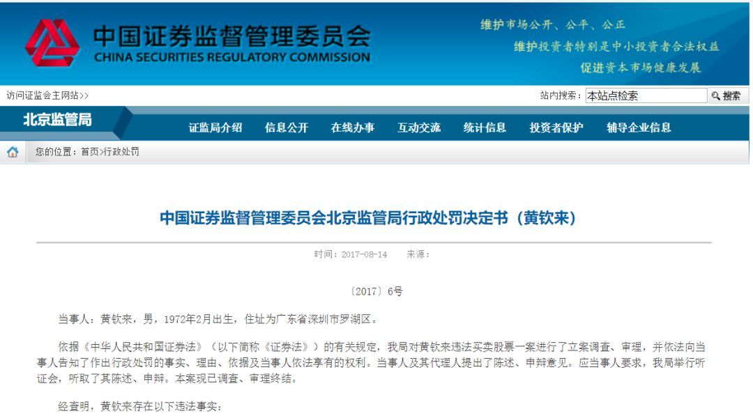 然而2017年8月,中国证监会北京监管局公布了的一则行政处罚决定书,将下面这位“黄钦来”公之于众。