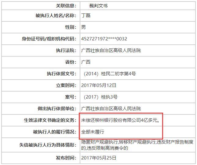 2015年至2017年间,丁磊共31次被列入最高人民法院的失信被执行人名单,其中多是因欠债被法院要求偿还却拒不履行。最近一次发生在2017年5月,未偿还柳州银行4亿多元,具体情形是隐匿财产规避执行、转移财产规避执行等。