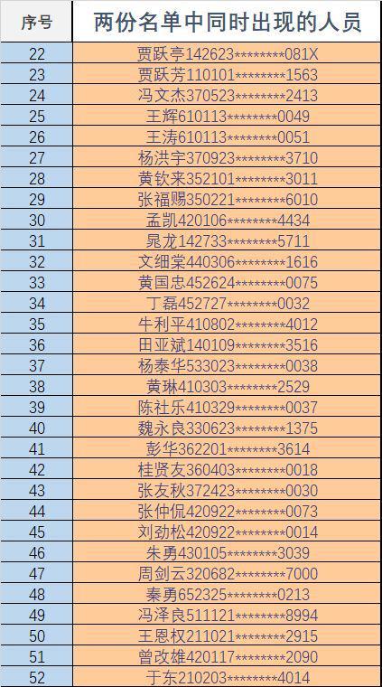 简单计算可得,这部分人数为138-86=83-31=52。小编整理并一一对照后发现,两份名单的前52人信息恰好一致,从第53人起出现差异。