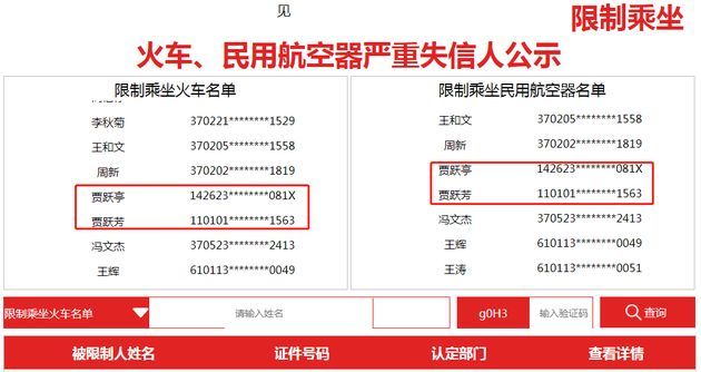 名单刚一公布,不少人就发现,限制乘坐火车和民用航空器名单上明晃晃地写着“贾跃亭”和 “142623********081X”,这一身份证号与中国执行信息公开网此前发布的乐视系创始人贾跃亭一致。也就是说,被限乘的正是大家熟知的那个贾跃亭。