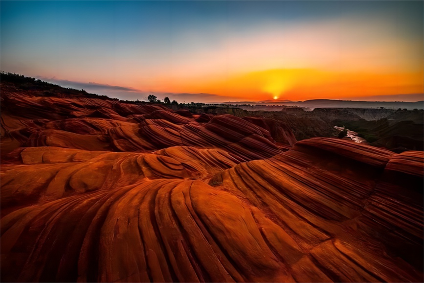 13.榆林市丹霞地貌采风游线路:榆林市→横山区白界镇黑峁墩村圁水山庄→靖边县东坑镇大漠酒业有限公司→靖边县龙洲镇龙一村丹霞地貌