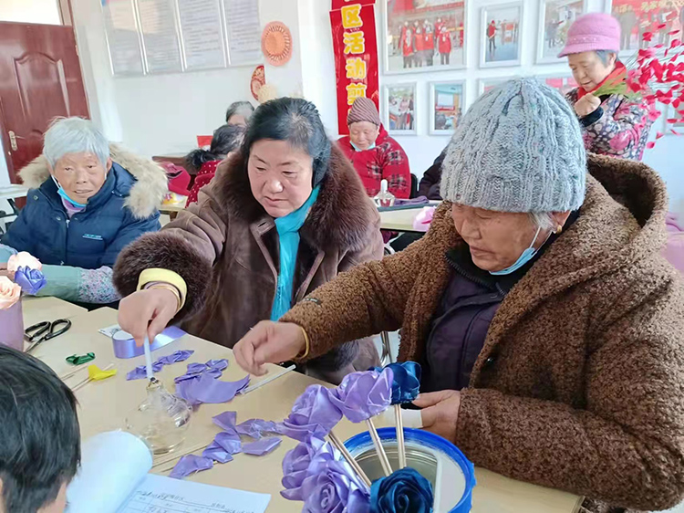 社区老人在志愿者带领下,学习丝带花制作。受访者供图