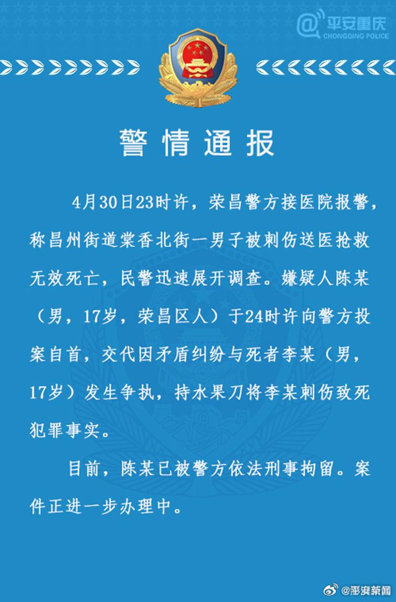 重庆荣昌警方5月1日发布《警情通报》:4月30日23时许,荣昌警方接医院报警称昌州街道棠香北街一男子被刺伤送医抢救无效死亡,民警迅速展开调查。嫌疑人陈某(男,17岁,荣昌区人)于24时许向警方投案自首,交代因矛盾纠纷与死者李某(男,17岁)发生争执,持水果刀将李某刺伤致死犯罪事实。目前,陈某已被警方依法刑事拘留。案件正进一步办理中。