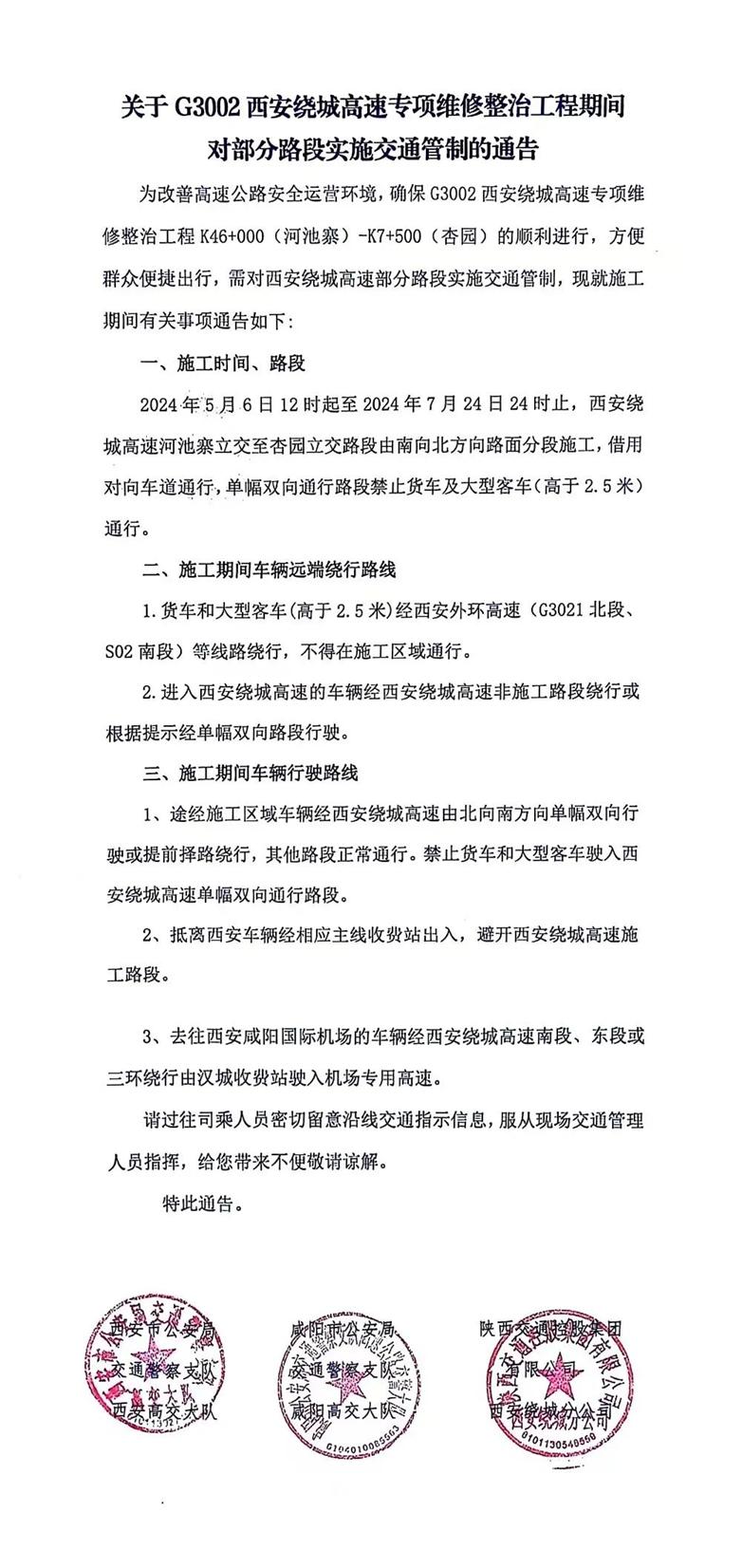 5月1日,西安发布《关于G3002西安绕城高速专项维修整治工程期间对部分路段实施交通管制的通告》。