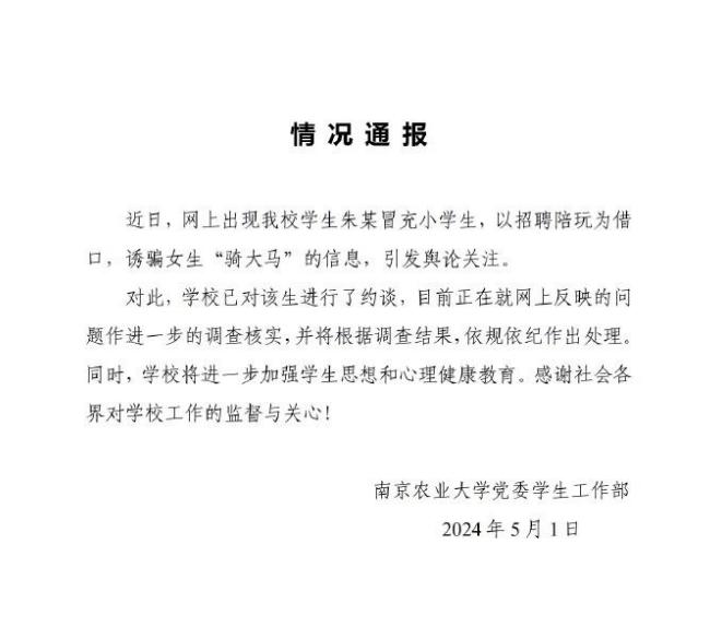 日前,多名江苏南京、苏州女大学生反映称,南京农业大学大四学生朱某,长期冒充6年级小学生的家长,以招聘陪伴小学生玩耍的兼职工作为借口,在网上诱骗多名女大学生,供其骑在肩膀上,朱某称之为“骑大马”。5月1日,南京农业大学发布情况通报:学校已对该生进行了约谈,目前正在就网上反映的问题作进一步的调查核实,并将根据调查结果,依规依纪作出处理。