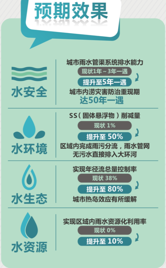 小寨区域海绵城市项目建成后,区域雨水管渠系统排水能力提升至5年一遇,城市内涝灾害防治能力提升至50年一遇;年径流总量控制率将由现在的38%提升至80%,城市热岛效应会有所缓解。