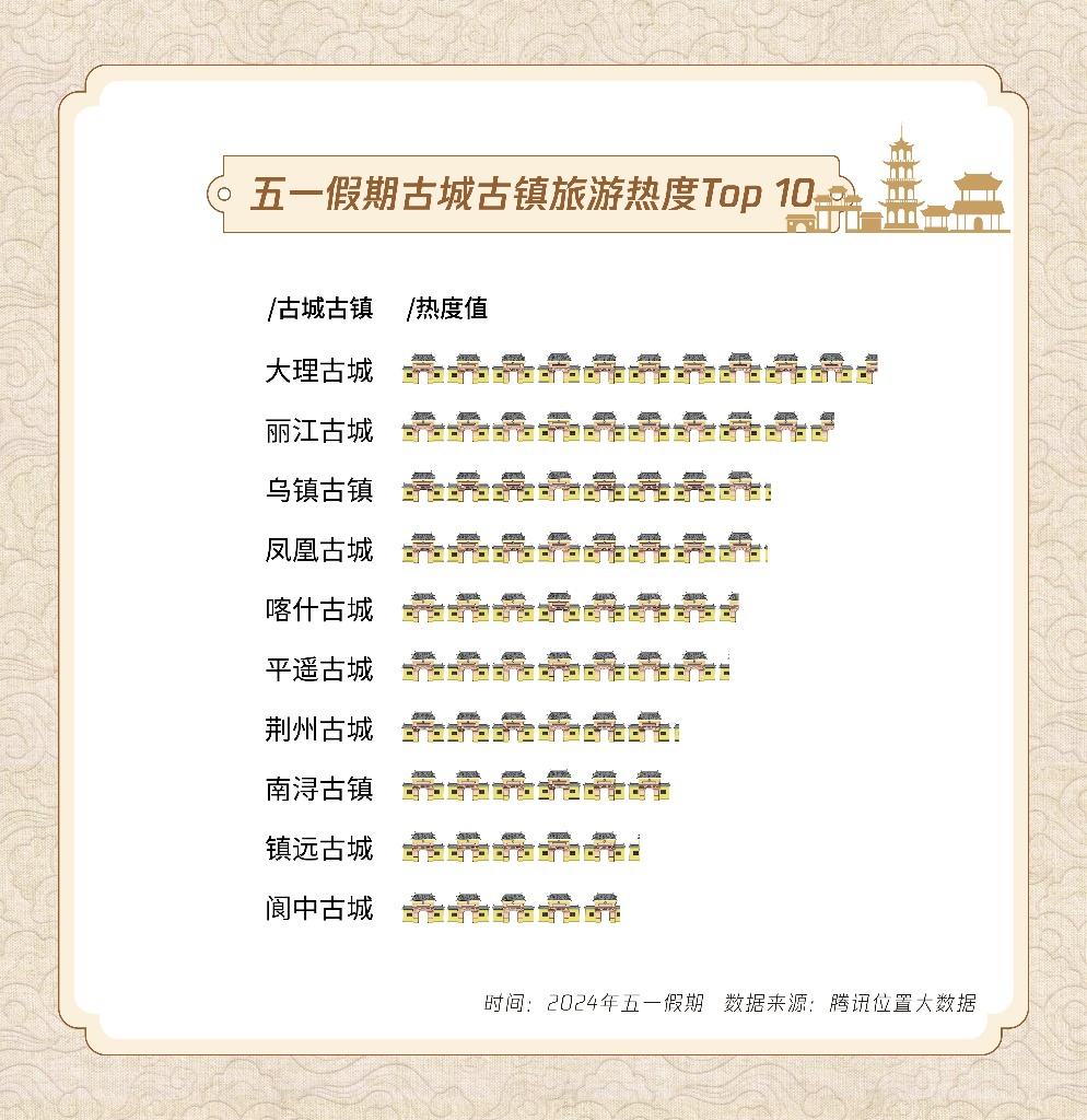 腾讯位置大数据显示,在全国热门古城古镇中,大理古城、丽江古城、乌镇、凤凰古城等客流热度位居前列。
