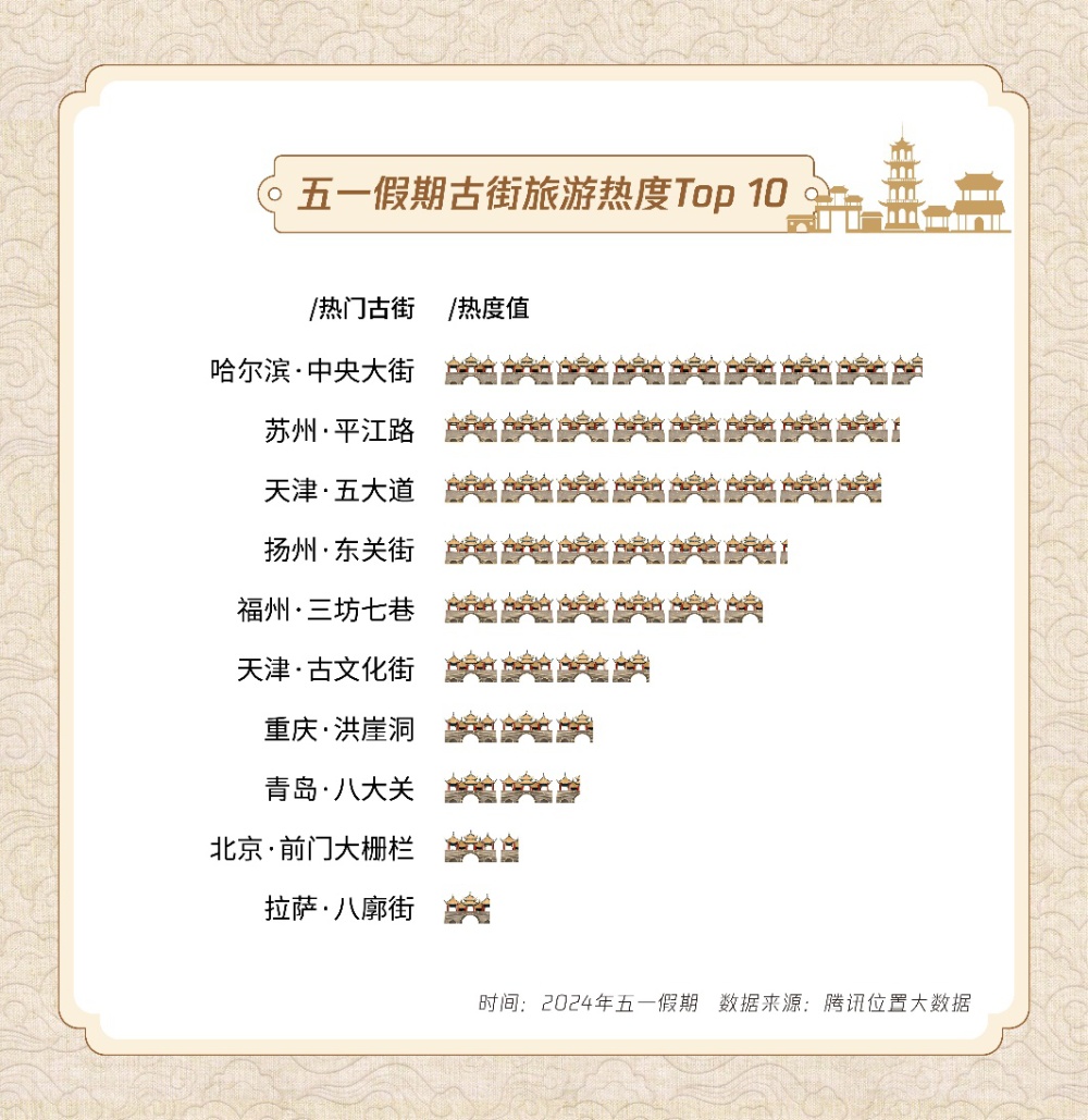 热门古街(及网红街区)中,哈尔滨中央大街依旧延续了超高人气。此外,苏州平江路、天津五大道等也迎来客流热度高峰。