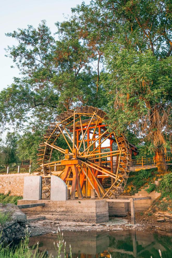 江背金洲筒车主题公园,位于浏阳河的第一道弯之上,此刻两岸绿树掩映,河水潺潺流动,倒影如油画般美妙。