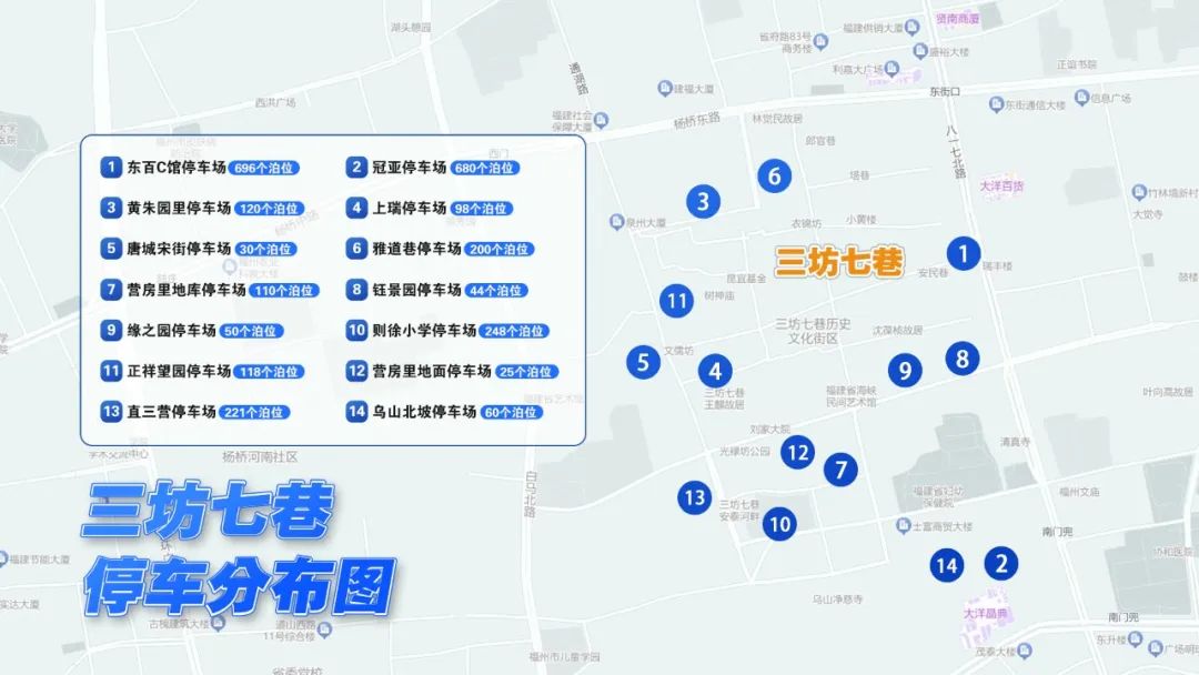 前往三坊七巷游览首推乘坐地铁出行,乘坐地铁1号线、4号线抵达东街口站,或乘坐地铁2号线抵达南门兜站,出站后步行几分钟即可到达景区。如需自驾前往的游客,可将车辆停放在景区附近的这些停车场: