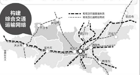 构建城市群对外运输大通道。加快构建“四纵四横”的对外运输大通道。推进银川—西安、西安—十堰、西安—重庆等高速铁路及兰州(定西)—平凉—庆阳—黄陵铁路建设。全面建成区域内国家高速公路网。