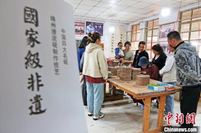 位于千年古村光村的国家级非遗绛州澄泥砚生产基地,游客正观赏砚台制作技艺。高新生摄