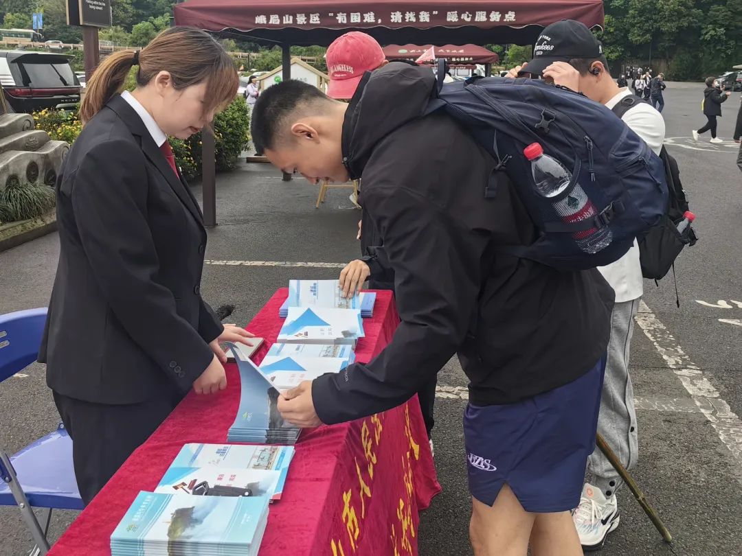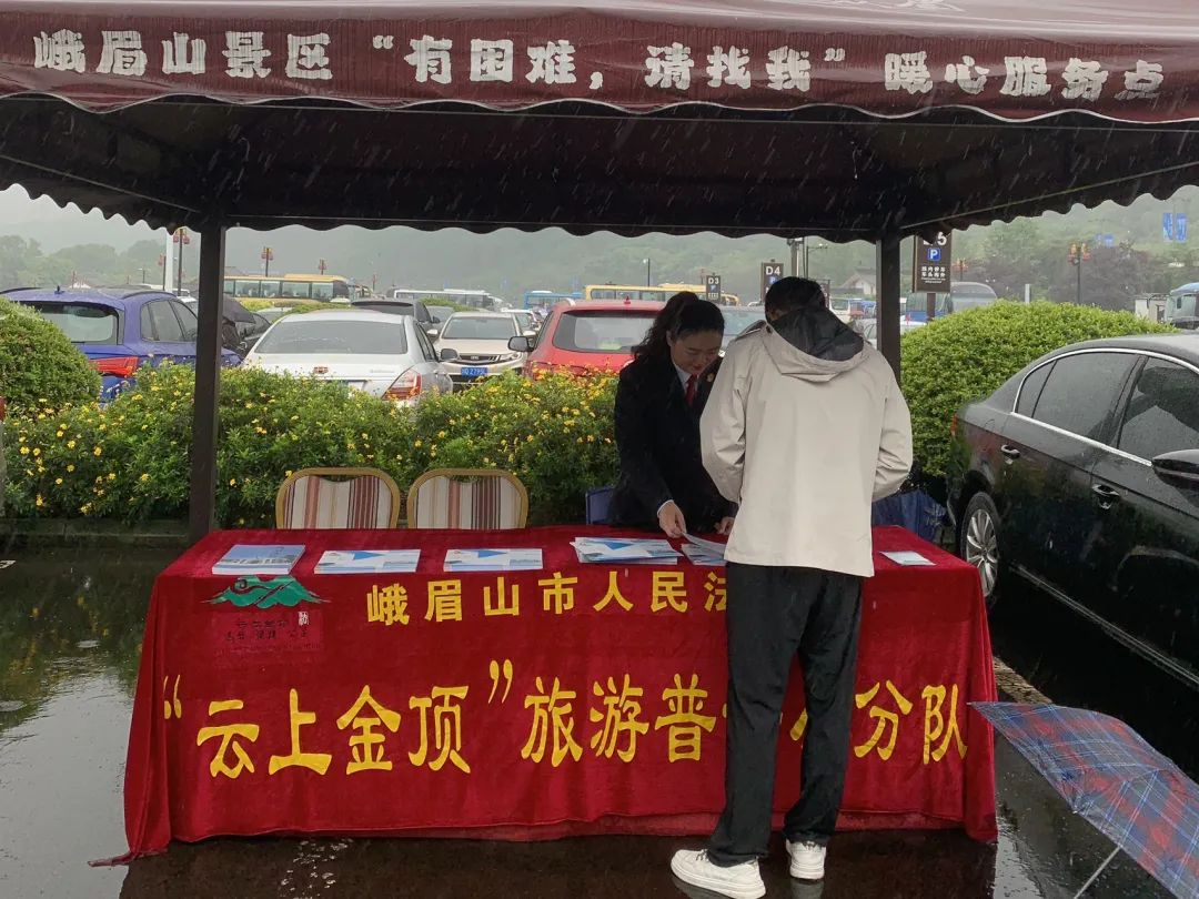 为了提高景区游客、商家的法治意识,让游客们在峨眉山玩得舒心、安心、放心,五一期间,“云上金顶”普法小分队的成员们继续坚守黄湾游客中心,驻守“云上金顶”法官工作站,为游客和商家提供法律服务,零距离开展普法宣传。