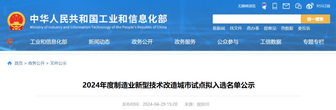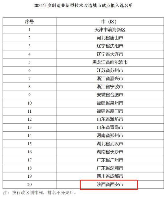 据悉,两部门已于近期组织开展了2024年度制造业新型技术改造城市的竞争性评审工作。根据评审结果,拟确定20个市(区)纳入试点范围。其中,陕西省西安市拟入选。公示期为2024年4月29日-2024年5月9日。