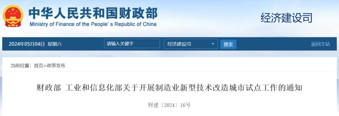 日前,财政部、工业和信息化部(以下统称两部门)发布《关于开展制造业新型技术改造城市试点工作的通知》(以下简称通知)。