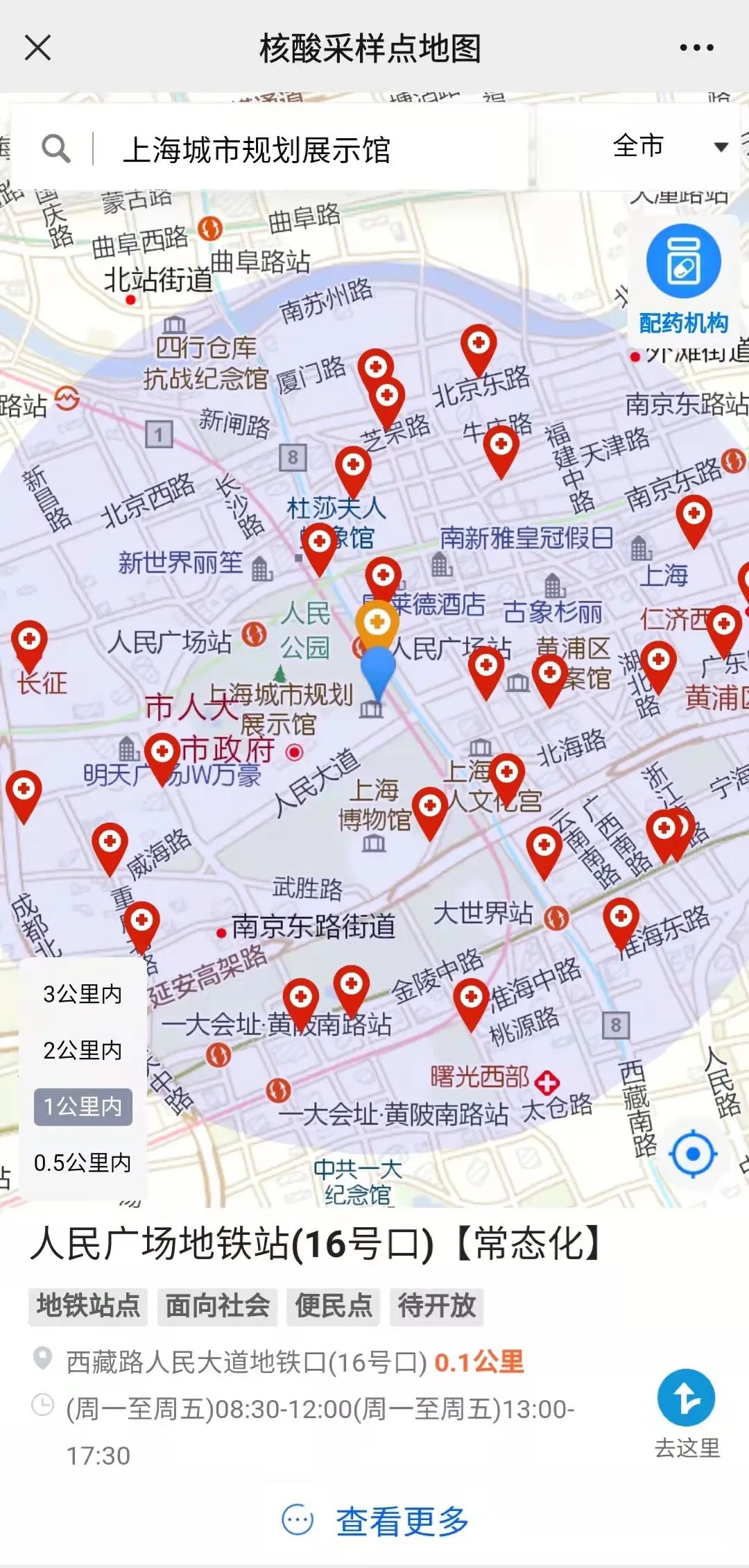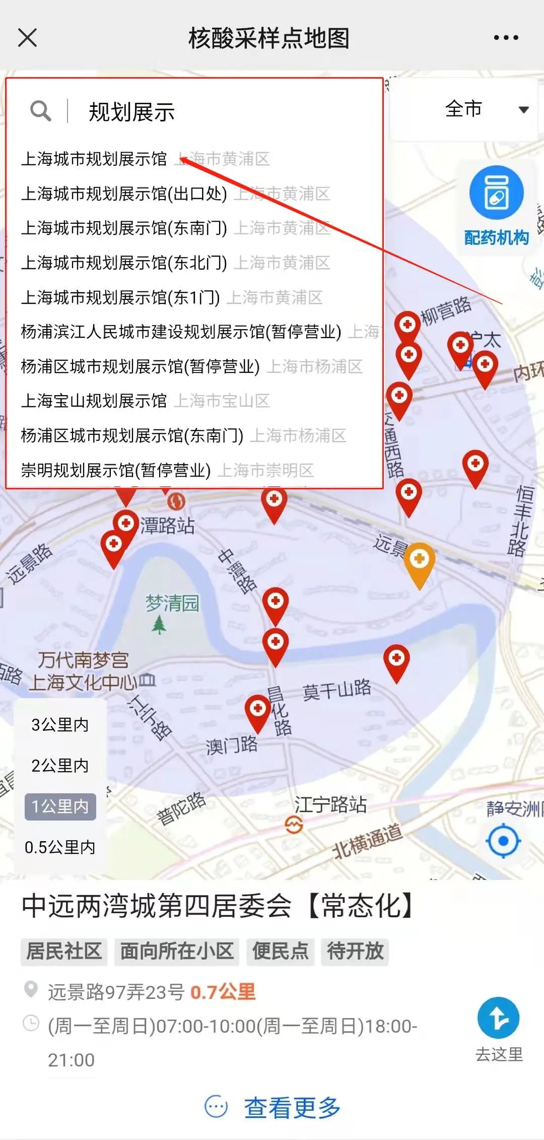您在系统上方的输入框中输入单位名称或目的地的关键字,如“规划展示馆”,系统会检索出与关键字相匹配的结果,选择其中符合您要求的名称或地址,即可定位到目的地,并显示该地附近0.5-3公里范围内的核酸采样点信息。