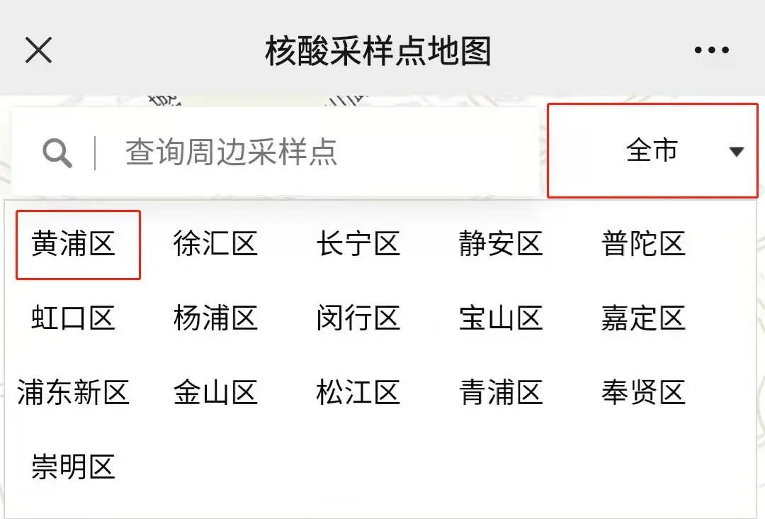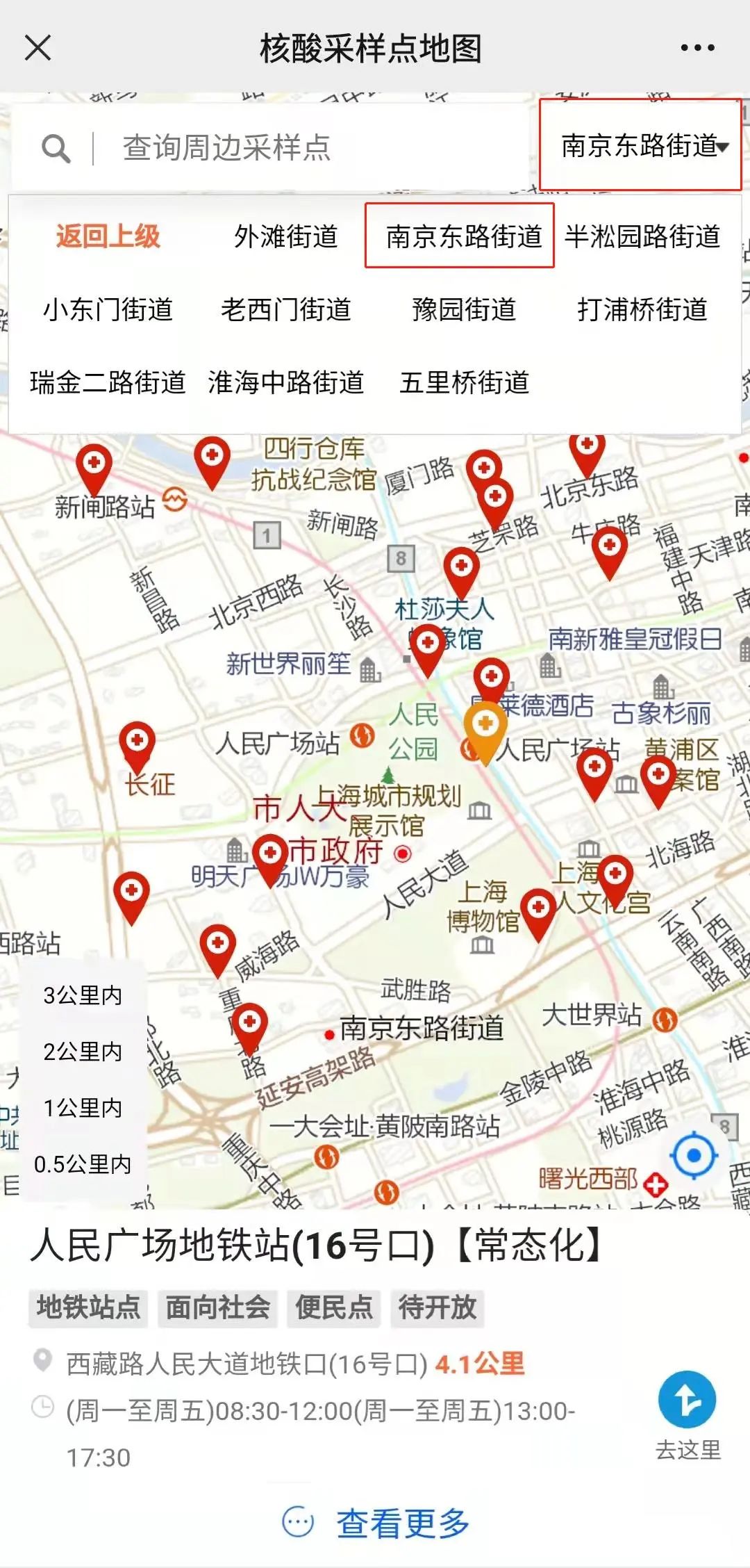 地图也为您提供了按区按街镇查询的功能,点击系统右上角按钮,在弹出框中选择想要查询的区划如“黄浦区”,系统会进一步细化展示街镇列表,通过点击街镇名称如“南京东路街道”,地图上会显示该街道范围内所有的核酸采样点分布情况。