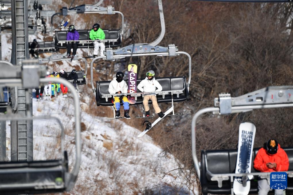 在宝鸡市太白县鳌山滑雪场内,滑雪爱好者乘坐缆车前往中高级道(2022年2月15日摄)。