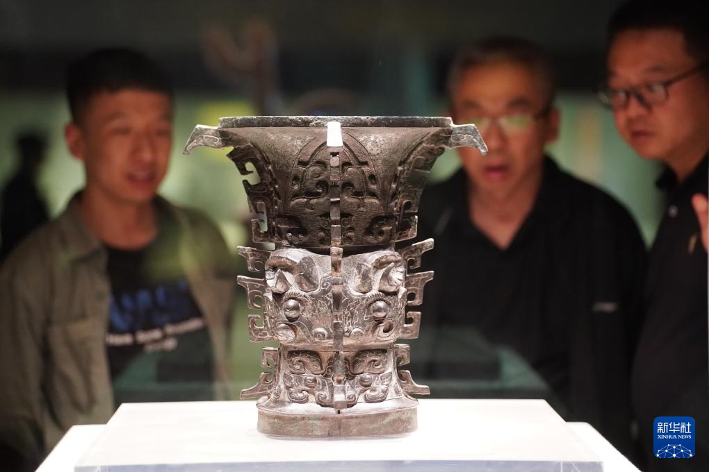 5月9日,游客在宝鸡青铜器博物院内参观西周文物何尊。