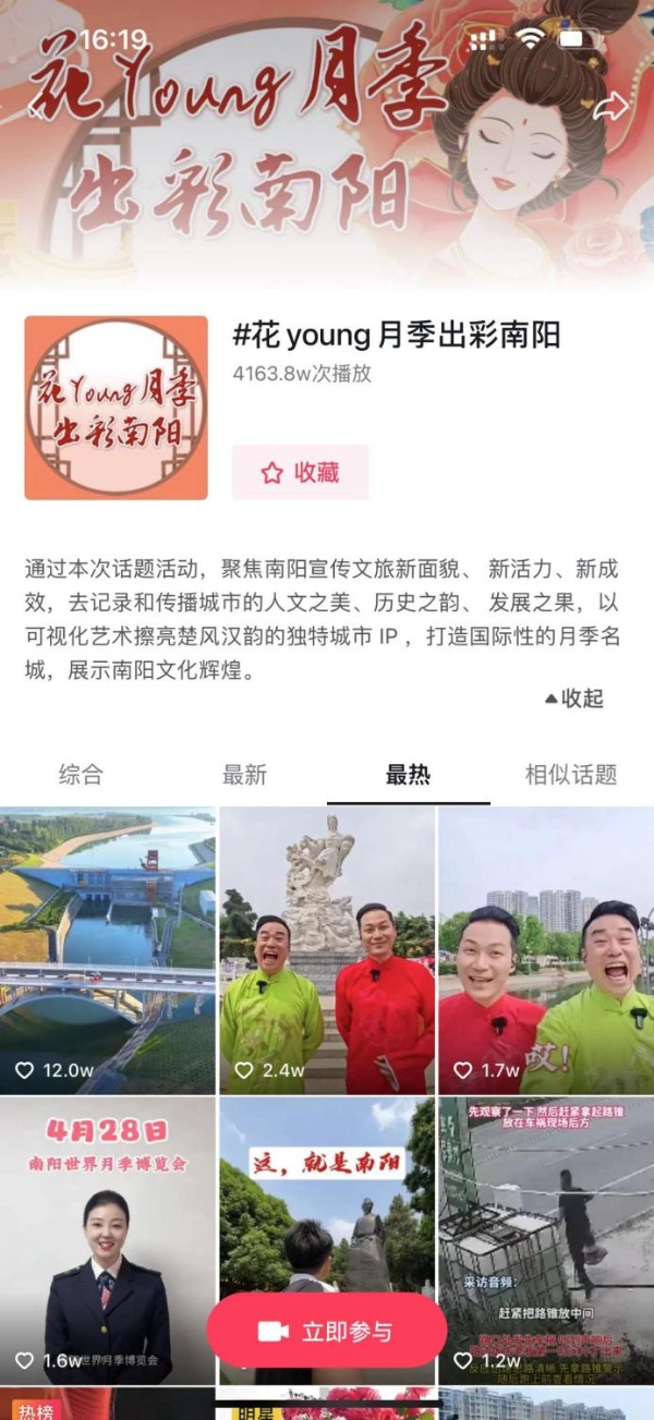 在抖音、微博、微信等各大网络平台,连日来,“花young月季 出彩南阳”短视频话题备受网民追捧,截至目前,仅抖音平台,播放量就达4163万,参与发布视频数量3300余条。全网百万粉丝网络大V“铁妞妞”“影老板”“红鲤鱼与绿鲤鱼”“洋盆友”“我的名字叫木鱼”等发布的短视频评论区内,更是一片为南阳叫好的声音,不少网民通过短视频去发现南阳、了解南阳、品读南阳。一顾惊艳、二顾倾心、三顾忘返的文化历史名城用无限的活力与魅力,让宾朋流连忘返,留下最值得铭记的时刻。