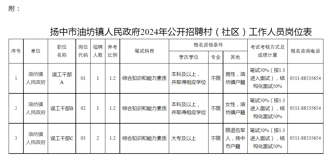 9.招聘岗位、人数和所要求的学历、专业、户籍等资格条件详见《扬中市油坊镇人民政府2024年公开招聘村(社区)工作人员岗位表》(附,以下简称岗位表)。