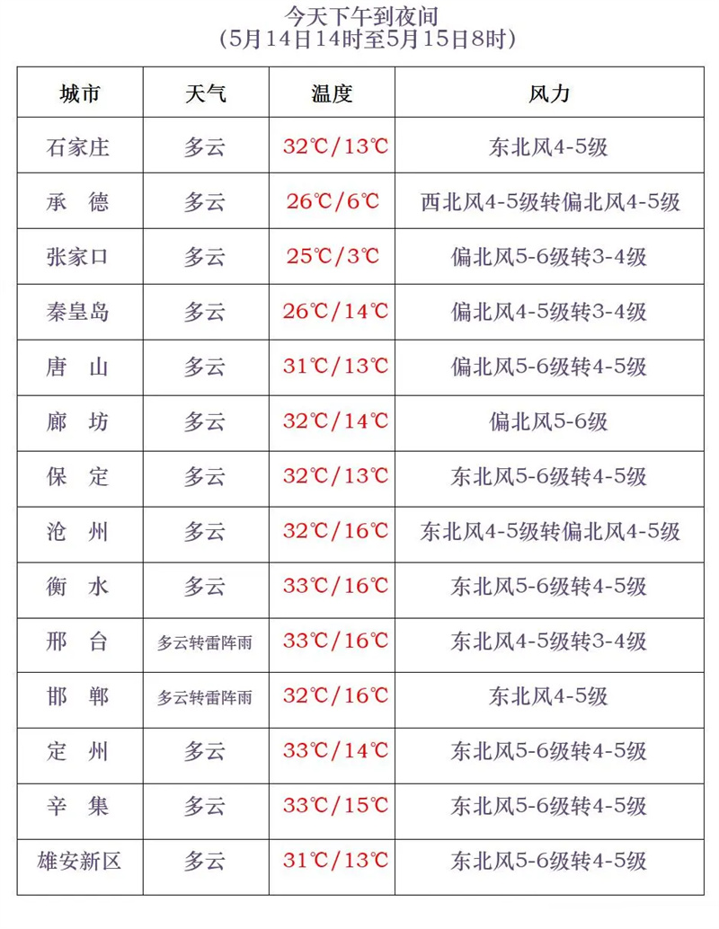 今天下午到夜间,保定、廊坊及以南地区晴转多云,短时阴有分散性雷阵雨或阵雨,雷雨时局地伴有短时大风等强对流天气,个别地点有冰雹,其他地区多云。
