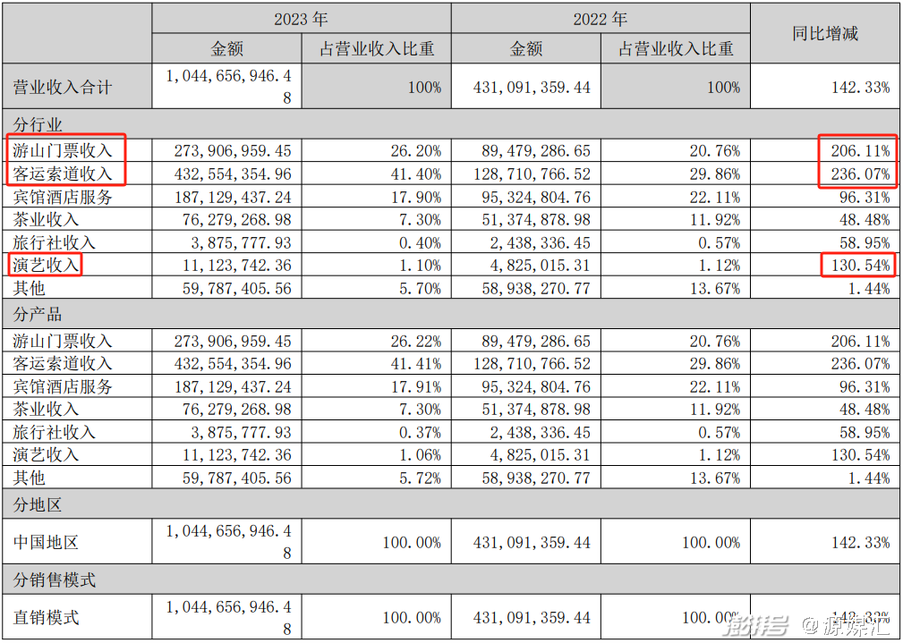 源媒汇梳理峨眉山A 2023年报发现,该公司2023年度营收为10.44亿元,相比2022年的4.31亿元增长了142.33%。公司旗下所有产品均同比增长,其中游山门票收入和客运索道收入增长最高,分别增长了206.11%和236.07%。此外,公司的演艺收入虽然占总营收的比重仅为1.10%,但是该项收入相较2022年增长了130.54%。演艺板块也有望成为公司营收的新增长极。