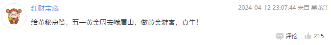 对于这位董秘的巧妙回答,投资者们纷纷点赞。同时还有投资者表示,“五一黄金周去峨眉山,做黄金游客”。该条评论也获得了众多点赞。
