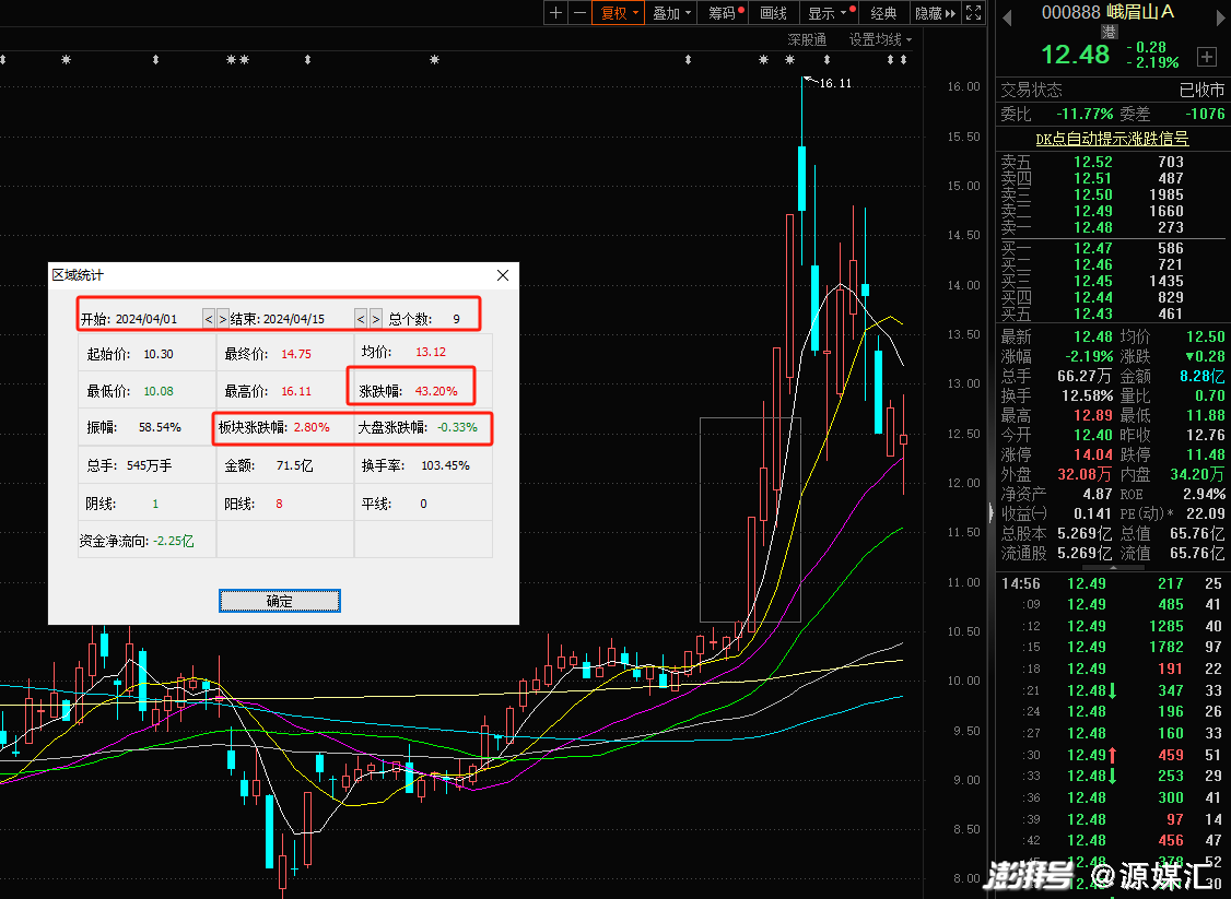 源媒汇统计发现,4月1日至4月15日,短短9个交易日里,峨眉山A的股价涨幅达到了43.20%,而同期旅游板块的涨幅为2.80%,大盘的涨幅仅为-0.33%。