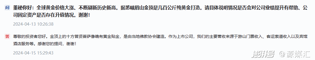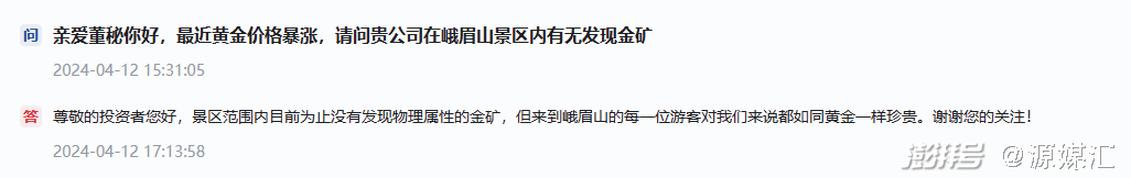 除了蹭上“黄金”的热度,峨眉山A董秘对市场传言的巧妙回复,也博得了投资者和游客的好感。