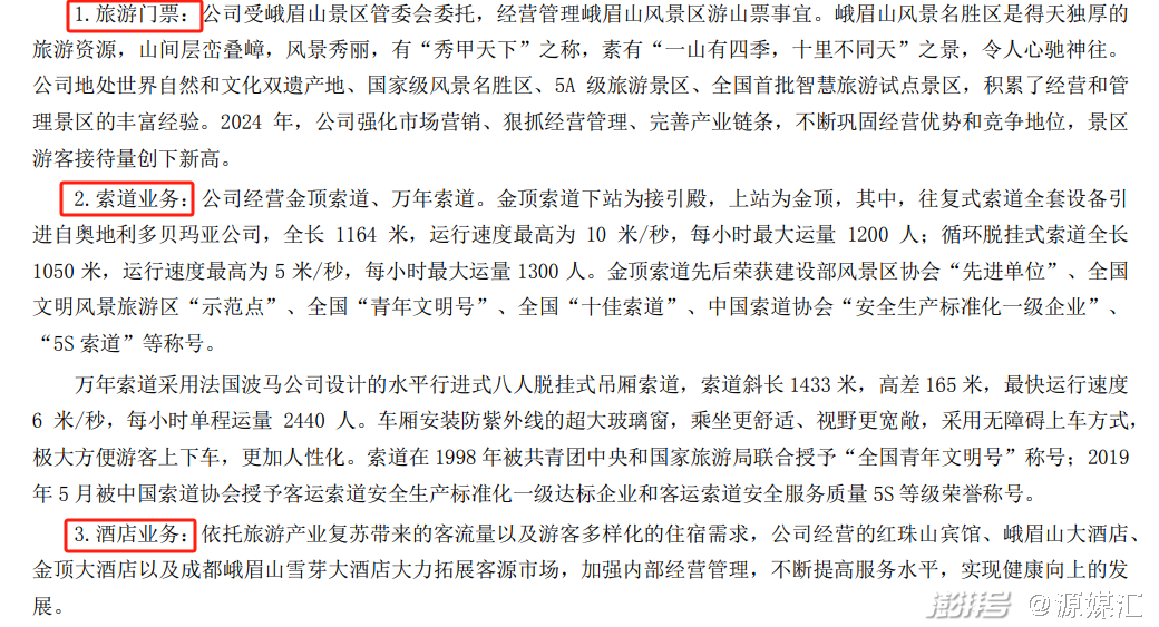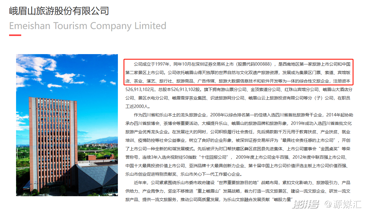 据峨眉山A官网介绍,依托峨眉山得天独厚的世界自然与文化双遗产旅游资源,公司已经发展成为集景区门票、索道、宾馆饭店、茶业、演艺、旅行社、旅游商品、广告传媒、旅游大数据信息技术和软件开发等为一体的综合性文旅企业。旗下拥有游山票分公司、金顶索道分公司、红珠山宾馆分公司、峨眉山大酒店分公司、景区水电分公司、峨眉雪芽茶业集团、识途旅游网分公司、四川领创数智科技有限公司以及峨眉山云上旅游投资有限公司等分(子)公司。