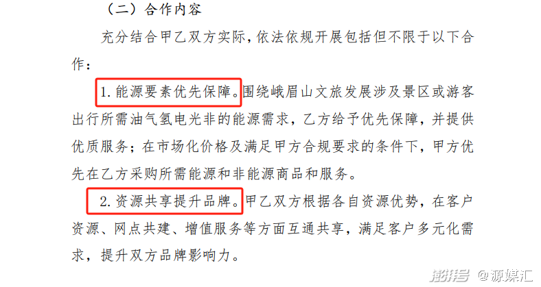 具体来看,双方的合作内容主要包含能源要素优先保障、资源共享提升品牌、推广峨眉山股份文旅项目和加强交流互惠共赢四方面。