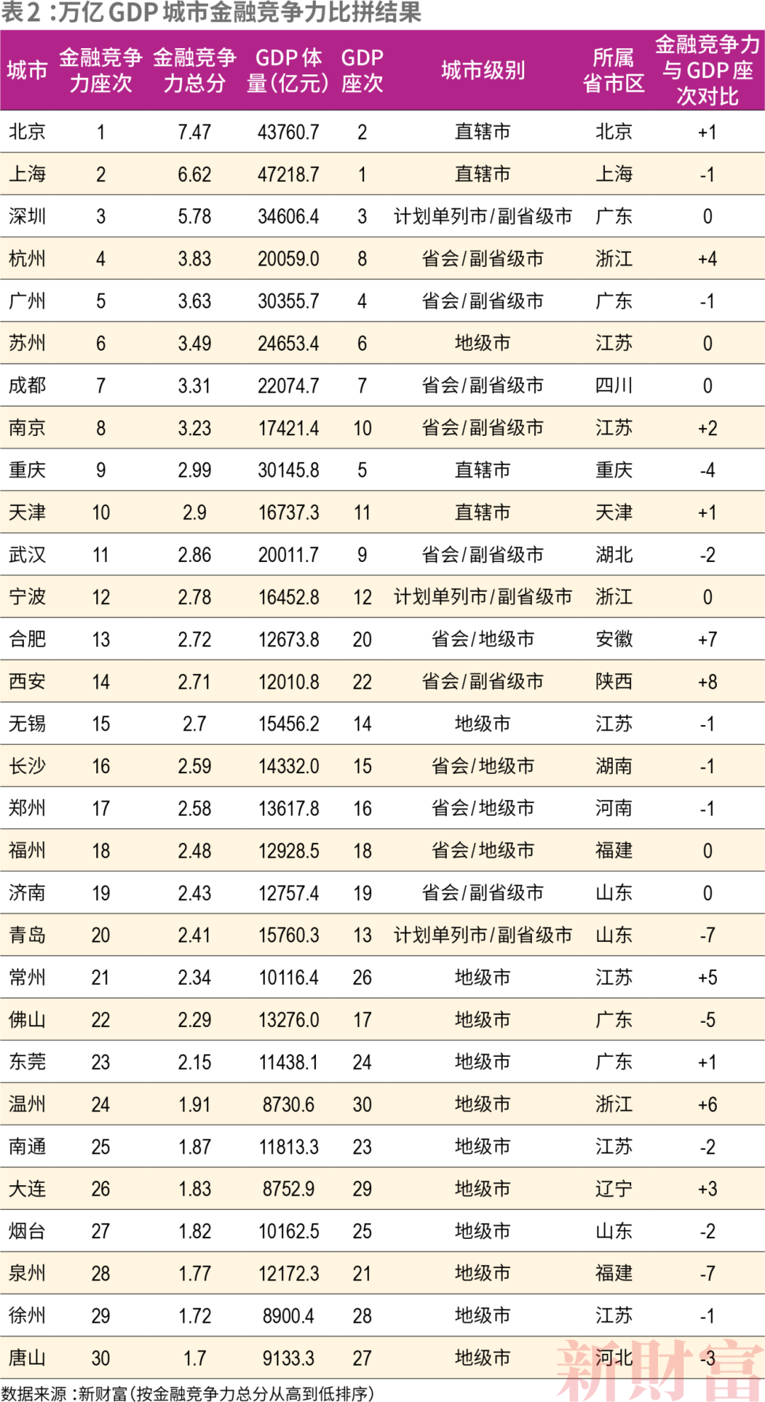 此外,4个万亿GDP预备城市唐山、徐州、大连、温州,也表现不错。温州的金融实力相较GDP位次也前进了6名,大连前进了3名。