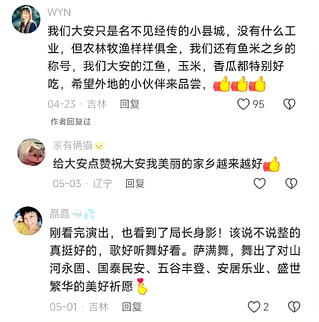 此外,“歌舞捺钵 劳动赞歌”主题晚会、“声悦大安·魅力江湾”大型文艺汇演、“韵美凤翎 歌震大安”“百年青春·当‘燃’有我”五四青年节专场演出也为广大游客提供了一场场视听盛宴,让游客在旅游过程中感悟中华文化、增强文化自信,游客互动积极、热情高涨。