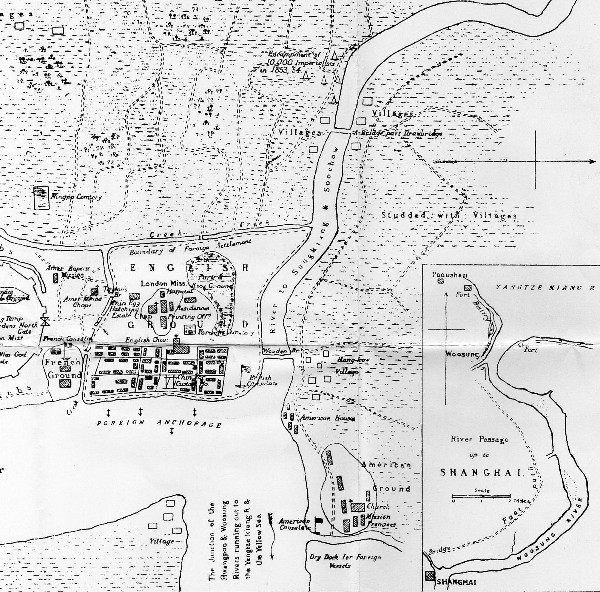 选自George Lanning等著The History of Shanghai,Trübner and co.1921. 图上可见1854年迁至虹口的美领馆以及1856年10月建于苏州河上的威尔斯木桥,在苏州河南一带标注有清军万人兵营(Encampment of 10,000 Imperialists in 1853,54),当为1854年春泥城之战后清军镇压小刀会的吉尔杭阿部营垒,所以此图实际创作年代应在1856年或稍后。