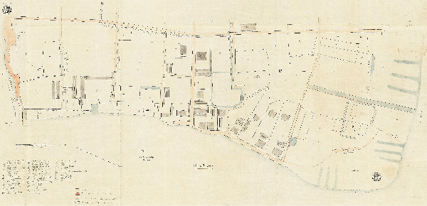 最近公开的一些近代早期英、法、美等国测绘的地图,反映了开埠之初苏州河及外滩地段的开发状况。如目前所知最早的上海近代实测地图——Plan of the English Settlement(《英租界平面图》,英国皇家地理学会藏,图2,刊于《上海城市地图集成》),大约成图于1847-1848年间,距离清道光二十五年(1845)划定英租界仅隔数年。此图清晰展现英人涉足上海之初外滩地段至苏州河南岸一带的城市景观。当时英租界的城市开发,大致限定在东沿黄浦江、西至church street(教堂街,即今江西中路)一带,北起苏州河河滩、南达洋泾浜(今金陵东路)的范围之内。其时租界中还有许多小河浜,城市尚属草创,数十幢西洋建筑主要聚集在面向黄浦江外滩一侧,而租界北面的苏州河沿岸还是一派河汊纵横的自然河道景象,租界北端的苏州河上甚至未见一座桥梁。