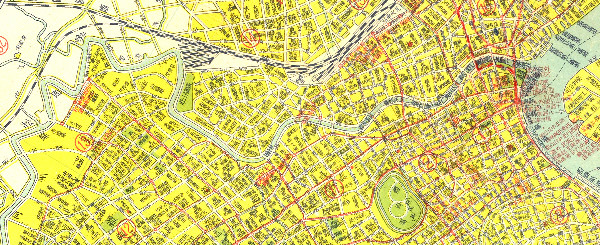 图6是《大上海里弄新地图》中的苏州河及南北两岸部分,该图发行于解放前夜的1949年1月,图上展现苏州河区域密集的道路网与成片开发的街区格局,与现代已经没有太大的差别,反映了这一地区的城市化已然成熟。