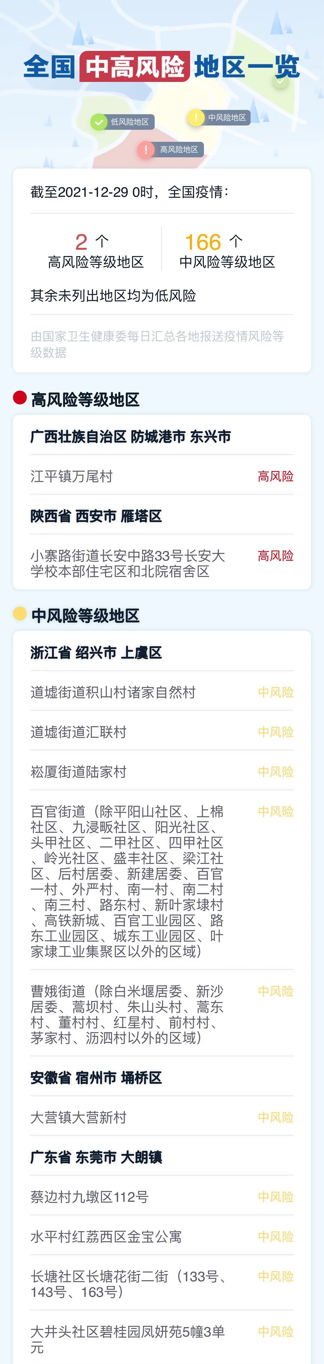4.截至12月29日0时,全国有2个高风险地区,166个中风险地区。