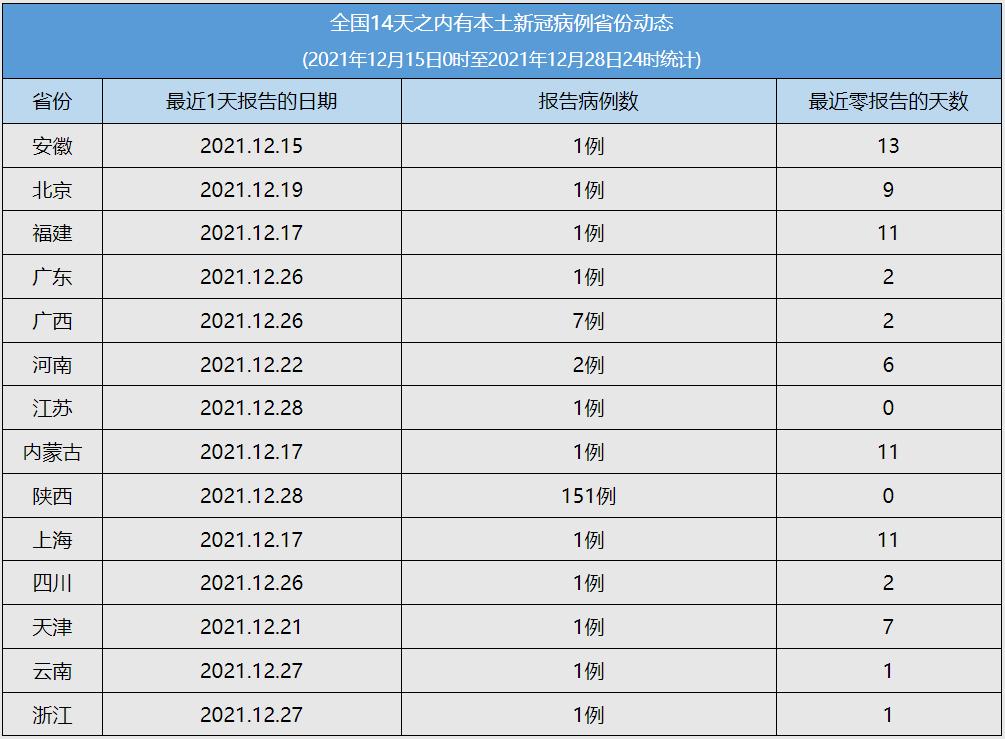 全国14天之内有本土新冠病例报告省份(按首字母顺序排序):安徽、北京、福建、广东、广西、河南、江苏、内蒙古、陕西、上海、四川、天津、云南、浙江
