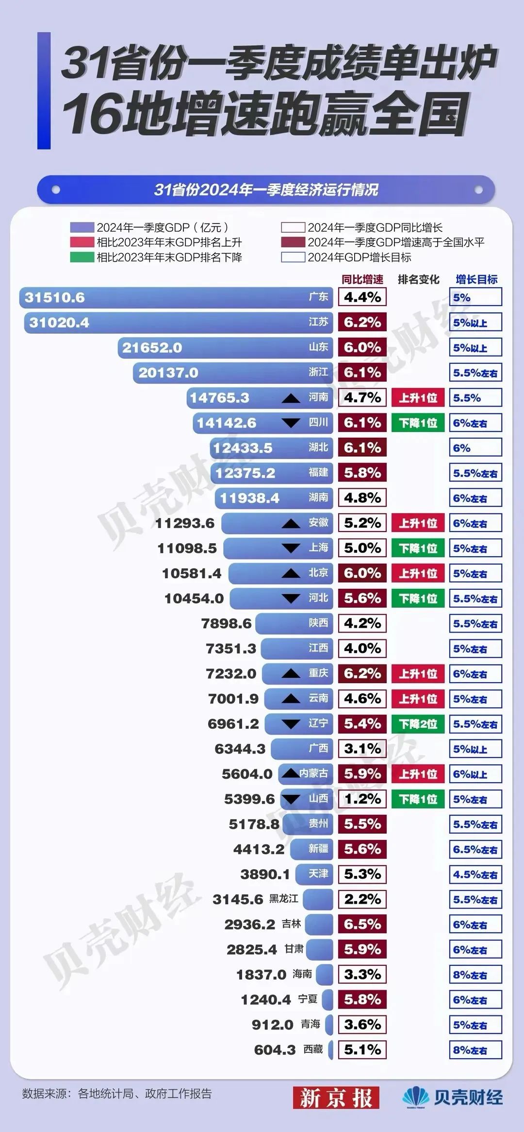 梳理发现,2024年一季度31个省份中,共有16个省份GDP增速超过全国5.3%的增速,26个万亿城市中,苏州以7.9%的增速领跑,西安增速为2.7%。