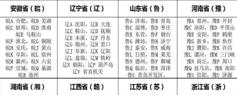车牌号是由省的简称+各个地级市的字母代码+5位车牌号组成。车牌号的第一位就是省的简称,以上就是各个省的简称。车牌号的第二位是英文字母,代表的是该车辆所在的地级市。地级市会根据排名来划分ABCDEFG等,5位车牌号是有三种规则来进行编码的,全部都使用阿拉伯数字、2位英文字母加3位阿拉伯数字,但是O和I不可以使用、每一位都可以单独去使用英文字母,但是I和O不可以使用。