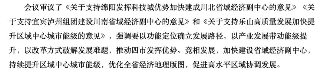 日前,四川省重要会议审议了《关于支持绵阳发挥科技城优势加快建成川北省域经济副中心的意见》《关于支持宜宾泸州组团建设川南省域经济副中心的意见》和《关于支持乐山高质量发展加快提升区域中心城市能级的意见》。