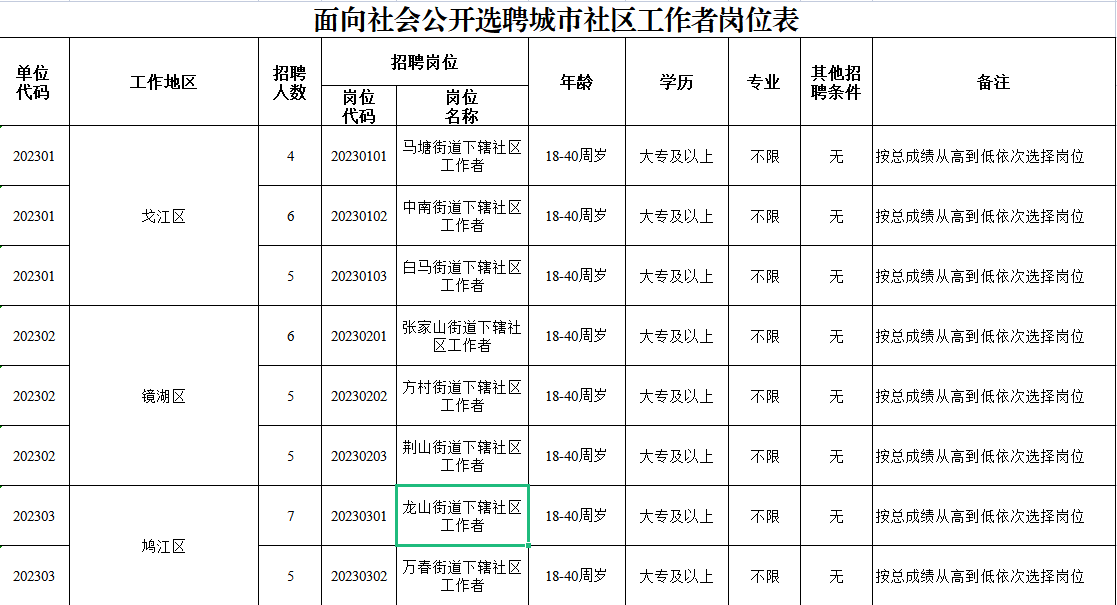 本次公开招录社区工作者43名,具体招录岗位详见《面向社会公开选聘城市社区工作者岗位表》。报考岗位以街道为单位,每名考生仅可报考一个岗位。