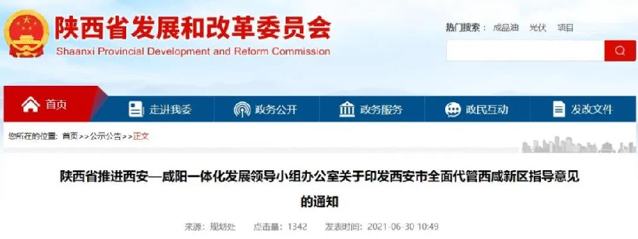 经省委、省政府同意,现将《关于西安市全面代管西咸新区的指导意见》印发给你们,请认真贯彻执行。