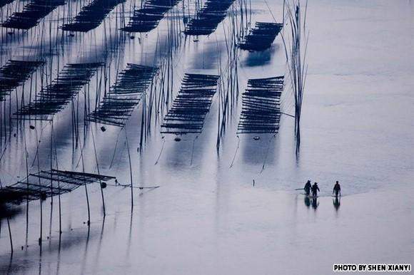 狭长斑驳的滩涂上,三三两两的散布着竹房、竹篙、浮筒和渔具等器物。这些人工制品与此地美丽的自然景观交相辉映。