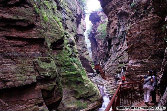 犹他州?不,这里是河南!U字形的龙潭峡谷长约12km,这是中国“最窄的峡谷”,谷内紫红色的石灰岩绣出一条条清晰的脉络。峡谷陡峭险峻的悬崖,郁郁葱葱的植物以及蜿蜒逶迤的山谷吸引着来自全国各地的游客。