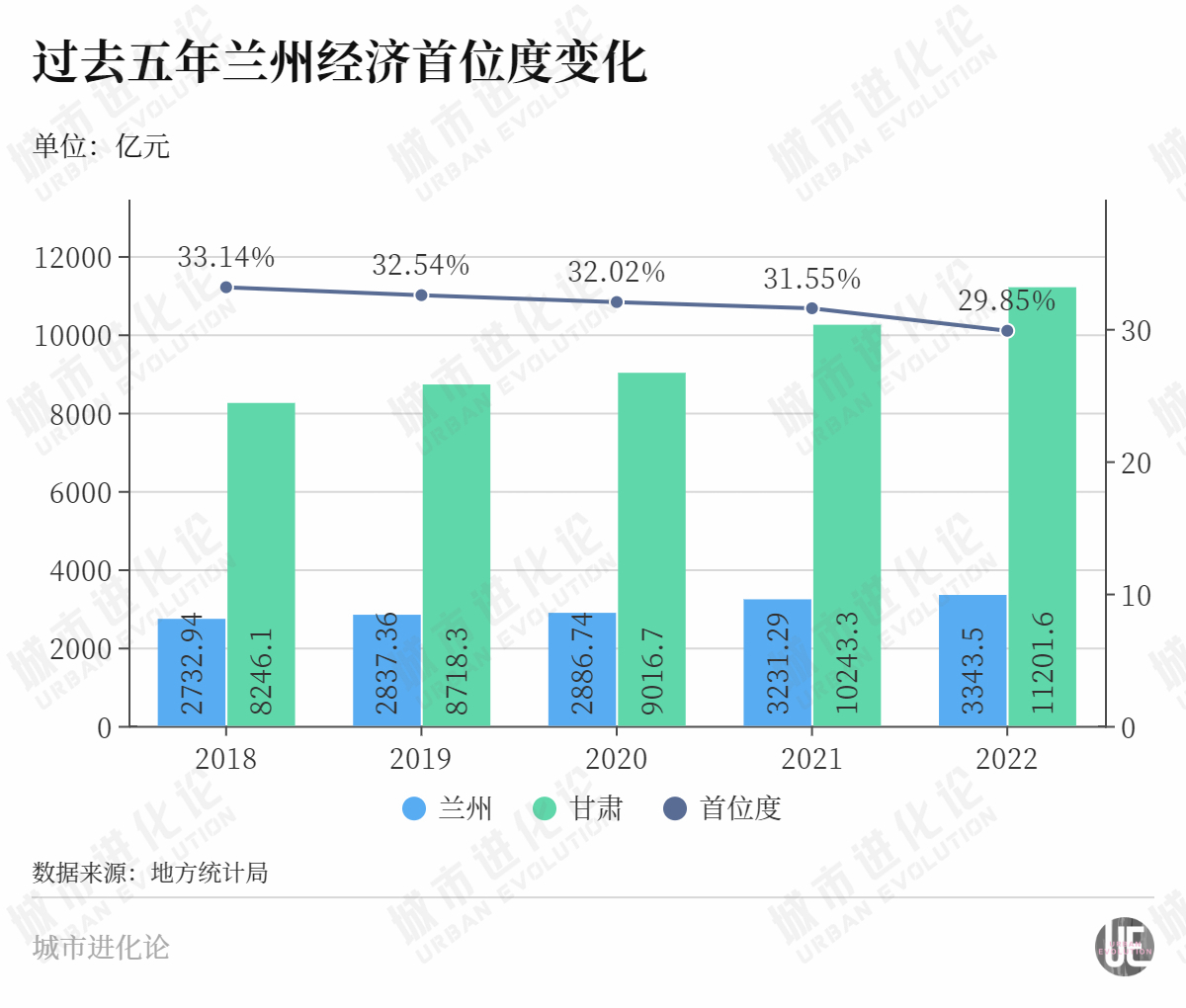 以经济首位度来衡量省会城市的强弱程度,一般来说,30%是基准线,超过30%被认为是强省会的标志。从这项数据来看,兰州曾“强”过,2018年其经济首位度逾33%,而五年间数据逐年下降,到2022年已降至29.85%,目前在西北五省会(首府)中仅高于乌鲁木齐。