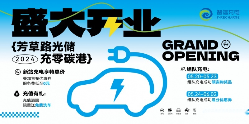 开业期间,进站就有好礼相送,新站开业首月享充电特惠价5折,首充服务费低至0元,充值享洗车免费,组队瓜分大奖!多重惊喜福利来袭,广大车主朋友可地图搜索“智信充电芳草路”导航到站。